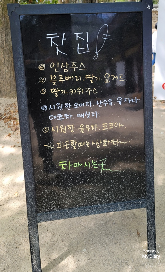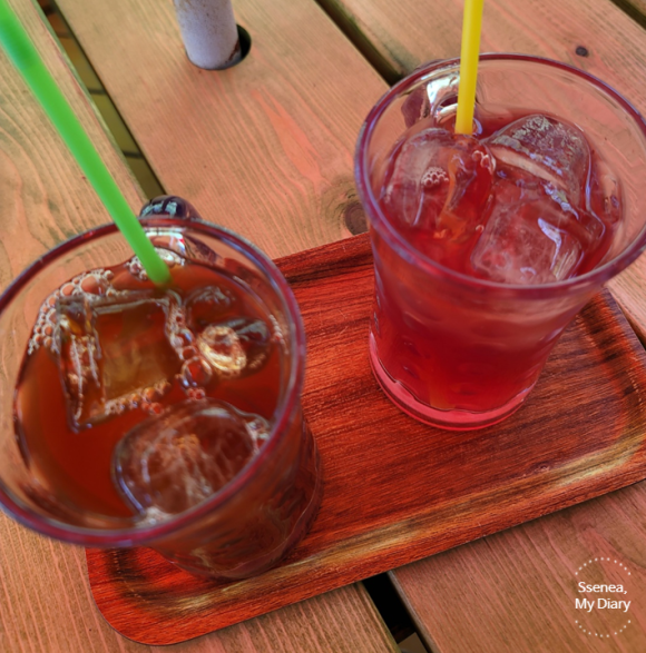 불국다원 내에 나무데크 위에 파라솔이 설치되어 있는 벤치에서 잠시나마 더위를 피하면서 체력을 회복 하기 위해 냉오미자차와 냉산수유차를 주문했다. 직접 담근 청으로 만든 차라고 말씀해주셨다.