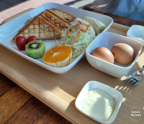 경주 원화루의 무료 조식의 구성은 핫샌드위치와 바나나, 구운 계란, 샐러드이다. 여자가 먹었을 때 조식의 양은 충분했는데, 샌드위치 추가요청은 해본적은 없지만, 부족하다고 느껴서, 추가요청을 하면 더 주신다.