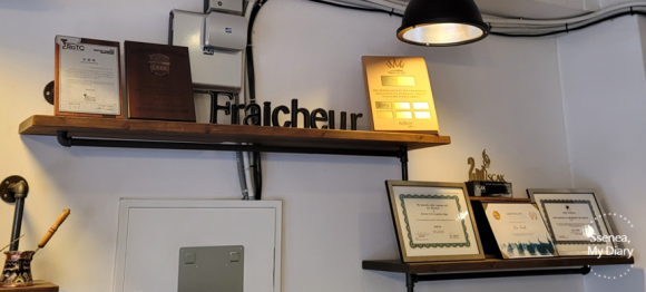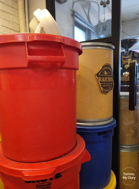 매장 입구에서 왼쪽 벽면을 보면 사장님께서 이것 저것 받으신 상장과 라이센스를 볼 수 있고, 오른쪽에는 커피콩을 직접 볶는 기계가 있다. 중간중간 커피 상태가 어떤지 확인하고 계신 듯 했다.