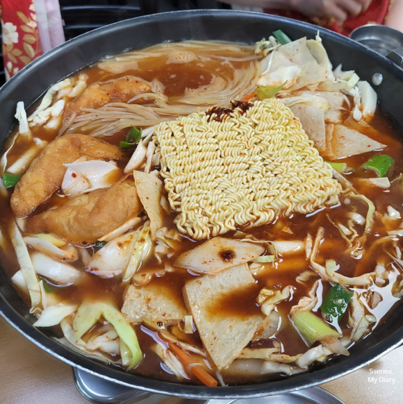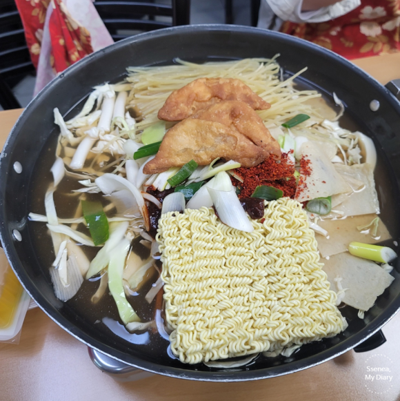 그리고, 매우 클래식한 야끼만두와 당면, 그리고 라면사리와 야채들이 들어가 있다.