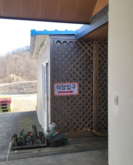 오른쪽으로 "식당입구"라고 써진 작은 간판이 있고,