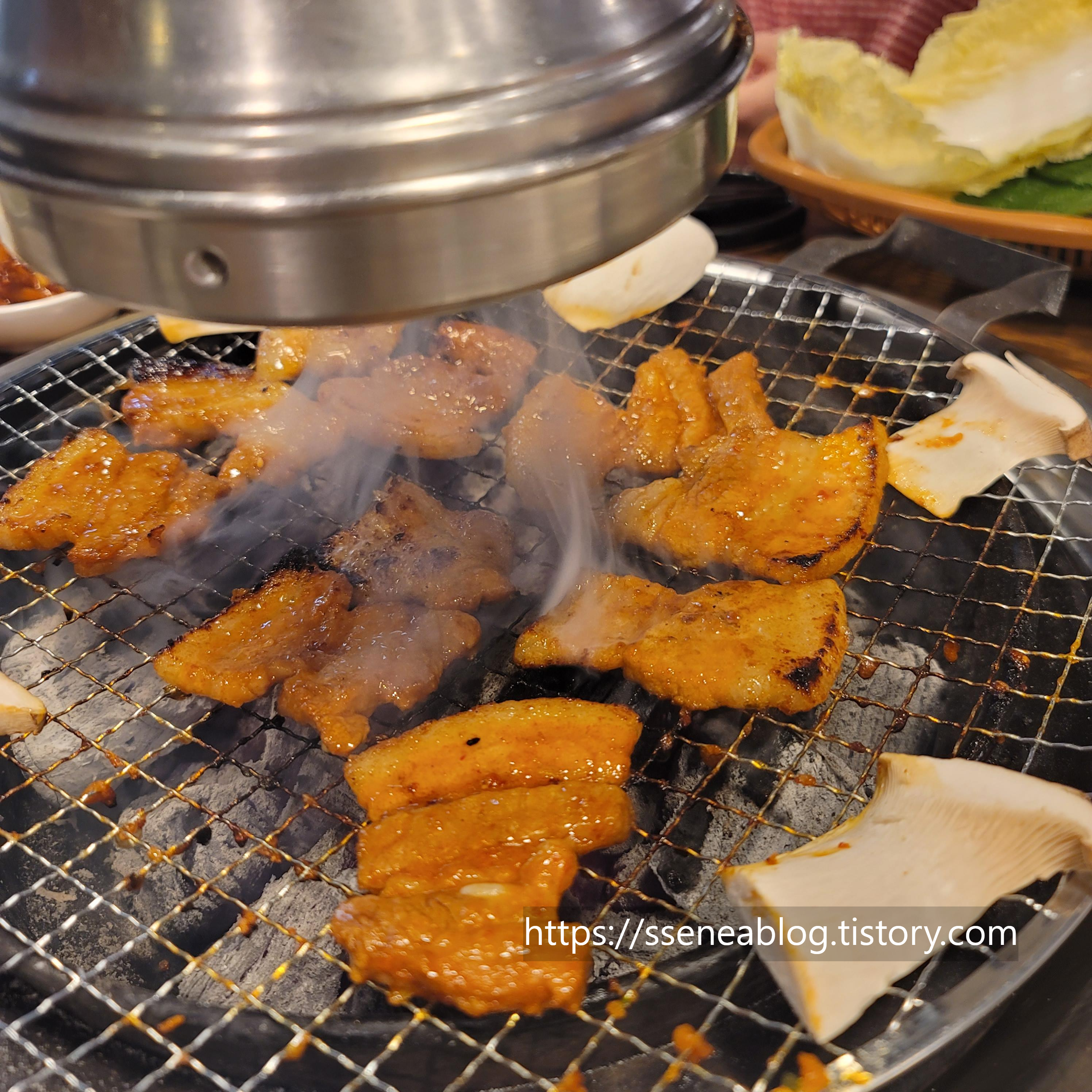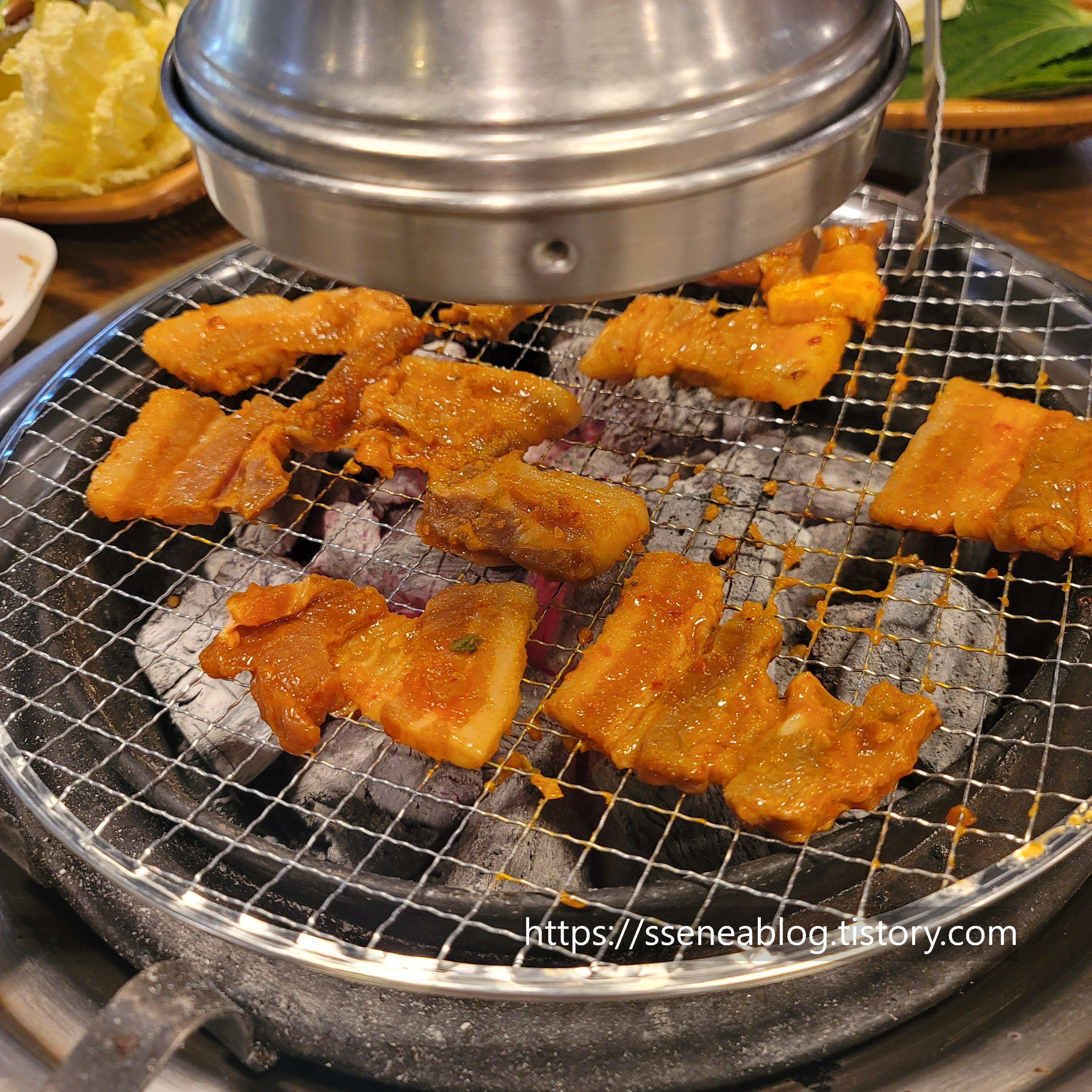 삼겹살은 야들하고, 숯불로 구워 양념은 진해지고, 다 구어진 고기는 식감이 쫄깃하다.