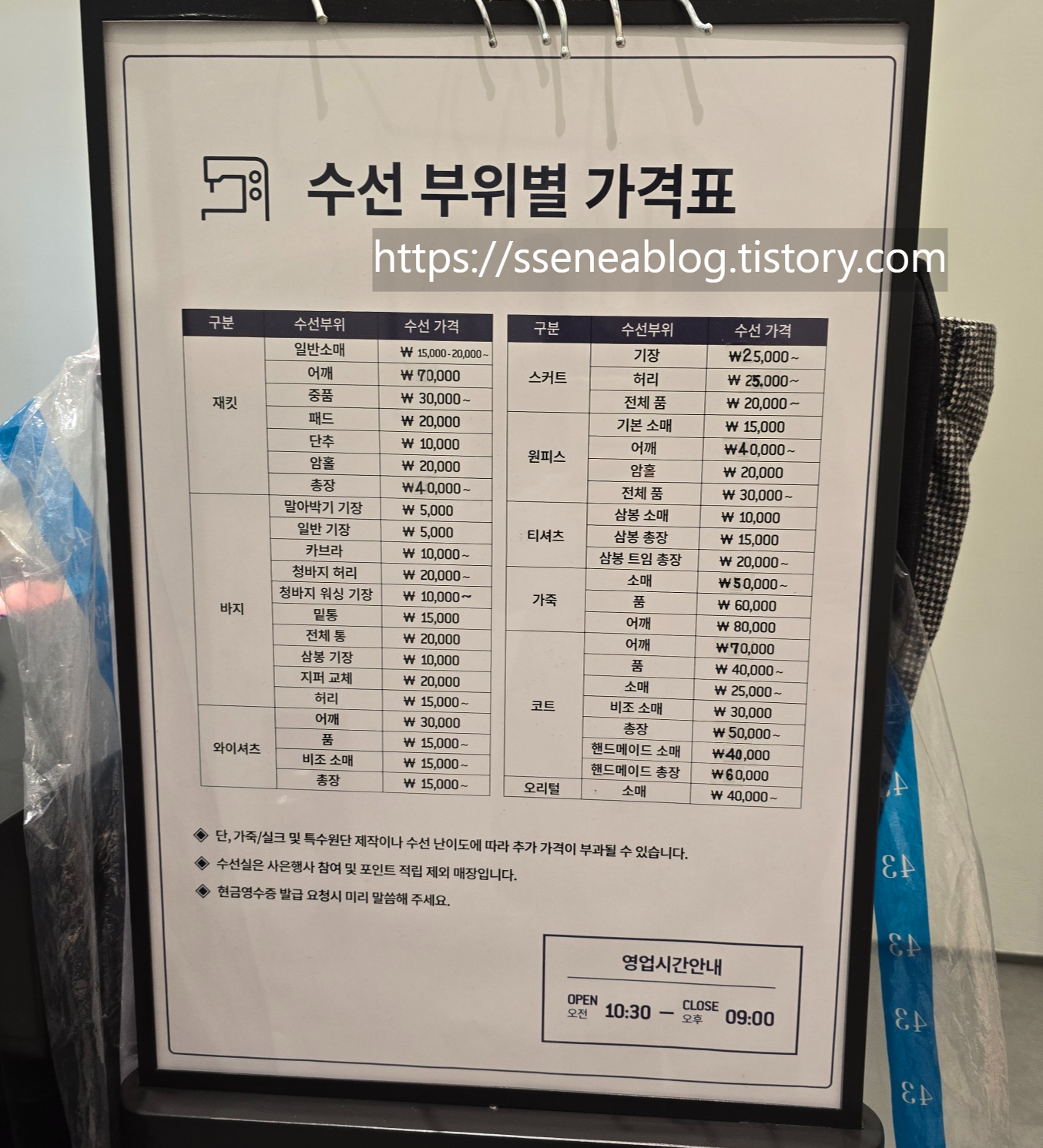 현대프리미엄아울렛 스페스원 수선실, 수선 부위별 가격표 (24.03월 기준)
