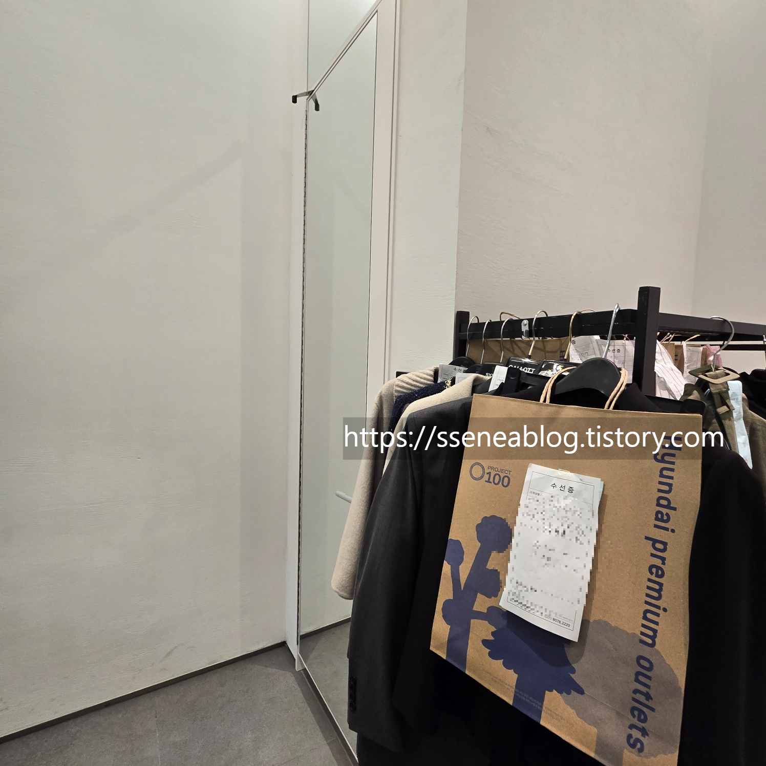 현대프리미엄아울렛 스페스원의 수선실을 들어가면 오른쪽으로 거울이 달린 문의 피팅룸이 있는데, 여기서 수선할 옷을 입고 나오면 담당자분께서 친절하게 어느정도 수선이 필요한지 피팅을 같이 봐주시고 잘라낼 길이를 같이 봐주신다.